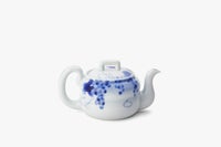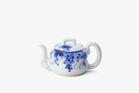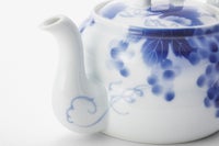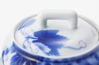 ぶどうの意匠は、古今東西を問わず吉祥紋様です。「用の美」 を追求した現代的な形姿に、100年前の下絵技法 「エアログラフ」によるブルーのグラデーションが真白な肌に染め込まれ、現代のブルー&ホワイトとして再現されています。白の間に、調子を取る様に伸びる 「つる」を手描きで入れているのも、一つ一つの表情の違いが器に温かで気韻ある印象を与える為です。熟練した職人の手技による現代のブルー&ホワイトには、明治期以来頑なに変わる事なく伝承してきた工芸品としての魅力が備わっています。