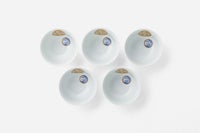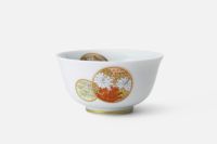 白き磁肌に遊ぶ丸紋は、西洋のドット模様を連想させモダンな印象を与えます。また、丸紋に丹念に描かれた五つの絵は古来からの吉祥文様である四君子「蘭・竹・菊・梅」とその永続を意図した「西海波」を赤絵付けしたものです。その華麗な色合いは食卓に彩りを添えてくれます。