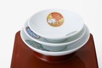 白き磁肌に遊ぶ丸紋は、西洋のドット模様を連想させモダンな印象を与えます。また、丸紋に丹念に描かれた五つの絵は古来からの吉祥文様である四君子「蘭・竹・菊・梅」とその永続を意図した「西海波」を赤絵付けしたものです。その華麗な色合いは食卓に彩りを添えてくれます。