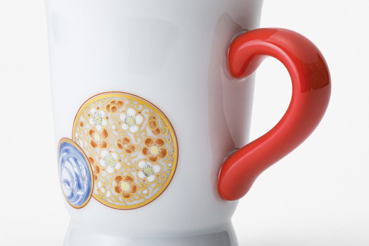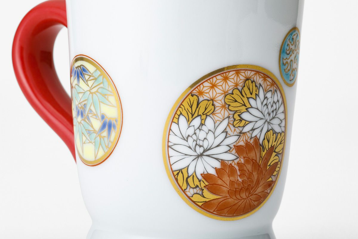 白き磁肌に遊ぶ丸紋は、西洋のドット模様を連想させモダンな印象を与えます。また、丸紋に丹念に描かれた五つの絵は古来からの吉祥文様である四君子「蘭・竹・菊・梅」とその永続を意図した「西海波」を赤絵付けしたものです。その華麗な色合いは食卓に彩りを添えてくれます。