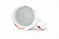 取手が大きくがっしりとしているのに驚くほど軽い「モーニングカップ」。 持ち手部分に小さな赤と水色の丸紋を浮かぶように配置し、本体にはドラマチックに四君子が映える構図が、使い手の心を躍らせます。