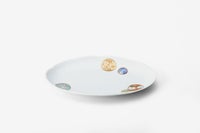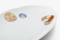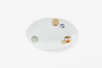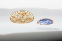 白き磁肌に遊ぶ丸紋は、西洋のドット模様を連想させモダンな印象を与えます。また、丸紋に丹念に描かれた五つの絵は古来からの吉祥文様である四君子「蘭・竹・菊・梅」とその永続を意図した「西海波」を赤絵付けしたものです。その華麗な色合いは食卓に彩りを添えてくれます。