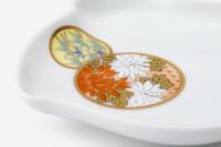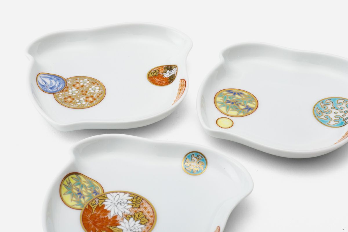 白き磁肌に遊ぶ丸紋は、西洋のドット模様を連想させモダンな印象を与えます。また、丸紋に丹念に描かれた五つの絵は古来からの吉祥文様である四君子「蘭・竹・菊・梅」とその永続を意図した「西海波」を赤絵付けしたものです。その華麗な色合いは食卓に彩りを添えてくれます。