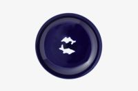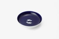 瑠璃地に白抜きで表している絵柄は「双魚紋=そうぎょもん」という、大変縁起の良い文様で、古代中国で富と子孫繁栄を願う吉祥文様であり、西洋でもオリエントの時代より豊穣の象徴と言われております。