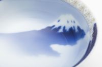 明治期以降、富士山をモチーフに多くの意匠を制作してきた深川製磁。エアログラフ(吹き付け)によるグラデーションは、官窯染付の良さを余すところなく表し、深川独自の「気韻」を醸しだしています。