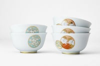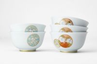 白き磁肌に遊ぶ丸紋は、西洋のドット模様を連想させモダンな印象を与えます。また、丸紋に丹念に描かれた五つの絵は古来からの吉祥文様である四君子「蘭・竹・菊・梅」とその永続を意図した「西海波」を赤絵付けしたものです。その華麗な色合いは食卓に彩りを添えてくれます。