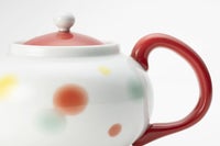 蓋と持ち手に優しい赤を配色することで、ふんわり踊るやわらぎ水玉とのバランスが相性よく、彩ります。ポットの持ち手の曲線は握りがよく、安心感があります。水玉模様が食卓に彩りと和らぎを与えてくれます。
