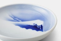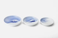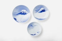明治27年、初代深川忠次は日本一の富士山と流水をトレードマークに深川製磁を設立します。 欧州より技術導入したエアログラフを用いた富士山は、吉祥の意匠として好んで描かれています。 箱根富士(6寸皿)武藤富士(5寸皿)垂井富士(4寸皿)と東海道の富士山は、箱根からは近景の富士、 武藤からは峠越しに、垂井(岐阜)からは遠景を描いています。