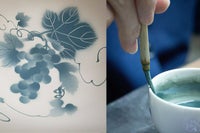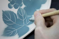 深川製磁ならではの澄み切った青色をつくり出すのは、コバルトなどの鉱物から調合した絵付け顔料「呉須」。この一色で微細な陰影、濃淡まで表現することを可能にしているのは、職人の経験と技。ときには何本もの筆を使い分けながら、繊細な筆使いで器に生命を与えてゆきます。この染付の工程を担う職人をはじめ、深川製磁には7人の伝統工芸士が在籍しています。絵付けに使われる絵の具には約600種類の色があり、そのほとんどが自家調合の深川オリジナルです。絵の具の調合には専門の職人がおり、毎日異なる気温や湿度によって微妙な調節をほどこしています。