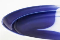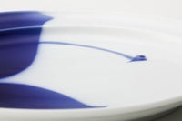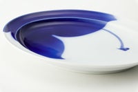 フカガワブルーで大胆にモミジを描いています。 窯の炎により変化する瑠璃の絶妙な色合いと、対比となる余白が美しい作品です。