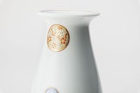 白磁と丸紋の配置がリズミカルに施され、華やかさとモダンさを兼ね備えた一品として、贈り物やご自宅用のインテリアにおすすめです。