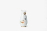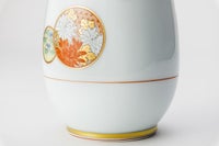 白き磁肌に遊ぶ丸紋は、西洋のドット模様を連想させモダンな印象を与えます。また、丸紋に丹念に描かれた五つの絵は古来からの吉祥文様である四君子「蘭・竹・菊・梅」とその永続を意図した「西海波」を赤絵付けしたものです。その華麗な色合いは食卓に彩りを添えてくれます。