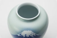 明治期以降富士山をモチーフに多くの意匠を制作してきた深川製磁が、その姿を染付の濃淡による光と影でやわらかく描写した作品です。 エアログラフ(吹き付け)によるグラデーションは、官窯染付の良さを余すところなく表し、深川独自の「気韻」を醸しだしています。