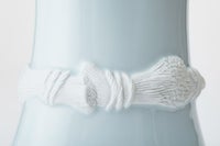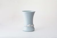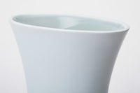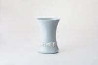 楕円形の魅力的な形姿の花生に、稲穂の陽刻をぐるりと施し、その部分だけ釉薬をかけずに1,350度の高温度の窯で焼き上げたものです。素地そのままに焼きあがった麦陽刻部分と、釉薬の掛かった透白磁にコントラストが魅力的な作品です。上質で工芸性の高い陶磁器でありながら、生けるお花を選ばない、シンプルなデザインとなっております。