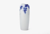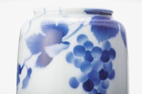 ぶどうの意匠は、古今東西を問わず吉祥紋様です。 用の美を追求した現代的な形姿に、百年前の下絵技法「エアログラフ」によるブルーのグラデーションが真白な磁器肌に染め込まれ、現代のブルー&ホワイトとして再現されています。白磁の間に、調子を取る様に伸びる「つる」を手描きで入れているのも、一つ一つの表情の違いが器に温かで気韻ある印象を与える為です。熟練した職人の手わざによる現代のブルー&ホワイトには、明治期以来頑なに変わる事なく伝承してきた工芸品としての魅力が備わっています。