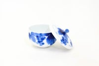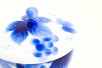 ぶどうの意匠は、古今東西を問わず吉祥紋様です。 用の美を追求した現代的な形姿に、百年前の下絵技法「エアログラフ」によるブルーのグラデーションが真白な磁器肌に染め込まれ、現代のブルー&ホワイトとして再現されています。白磁の間に、調子を取る様に伸びる「つる」を手描きで入れているのも、一つ一つの表情の違いが器に温かで気韻ある印象を与える為です。 ほんの少し器にこだわれば贅沢な気分になります。急須、ポットでお茶を入れる所作の美しさは日本の粋、 お茶の香りとお茶の色は真白な磁器肌で際立ち、くつろぎと安らぎを与えてくれます。