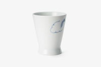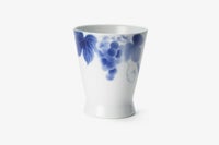 ぶどうの意匠は、古今東西を問わず吉祥紋様です。「用の美」 を追求した現代的な形姿に、100年前の下絵技法 「エアログラフ」によるブルーのグラデーションが真白な肌に染め込まれ、現代のブルー&ホワイトとして再現されています。白の間に、調子を取る様に伸びる 「つる」を手描きで入れているのも、一つ一つの表情の違いが器に温かで気韻ある印象を与える為です。熟練した職人の手技による現代のブルー&ホワイトには、明治期以来頑なに変わる事なく伝承してきた工芸品としての魅力が備わっています。