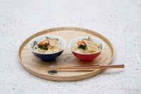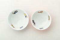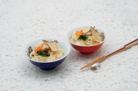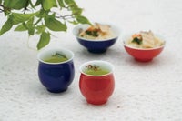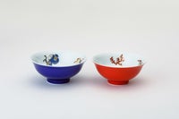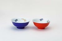 この組飯碗は、外側は青色と赤色の2色、中には宝づくしの絵柄が描かれています。宝物を集めた宝づくしの文様は代表的な吉祥文様のひとつで、福徳を招くとされています。