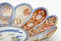 菊割の輪花鉢は、柿右衛門様式として広く知られています。19世紀末新しい有田の意匠として1900年パリ万国博覧会に出展した深川忠次は、彼のオリジナルデザインをパッチワークのようにこの輪花鉢の花弁に施しました。