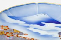 深川製磁は富士山をモチーフに多くの意匠を製作してまいりました。そこには独自の美意識があり、富士山を吉祥の象徴として捉え、そこに伝統的文様を配しています。富士山の変わらぬ美しさを金彩と赤絵の「波に桜紋」が引き立てています。