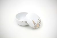 また、深川ブルーとよばれ海外にもてはやされた染付のボンボニエールは、合わせの部分に唐草を施し、白磁と澄んだ青色の染付とのコントラストが魅力になっております。