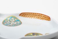 白き磁肌に遊ぶ丸紋は、西洋のドット模様を連想させモダンな印象を与えます。また、丸紋に丹念に描かれた五つの絵は古来からの吉祥文様である四君子「蘭・竹・菊・梅」とその永続を意図した「西海波」を赤絵付けしたものです。その華麗な色合いは食卓に彩りを添えてくれます。