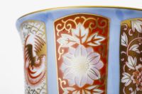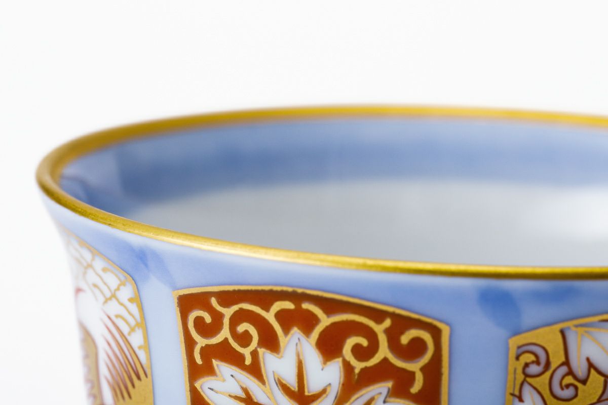このデザインは、オールド伊万里の金襴手とは、異質な文様として陶磁器愛好家のコレクションになっております。 当社は、現在まで100年以上このデザインを大切に継承してきました。明治期の華やかな意匠を窓絵にし、ワインカップに施した作品です。