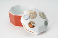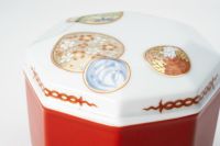 古来からの吉祥文様である四君子「蘭・竹・菊・梅」とその永続を意図した「西海波」を赤絵付けしたロングセラー「寿赤絵 ことぶきあかえ」シリーズに新しいカタチの八角蓋物が誕生しました。