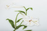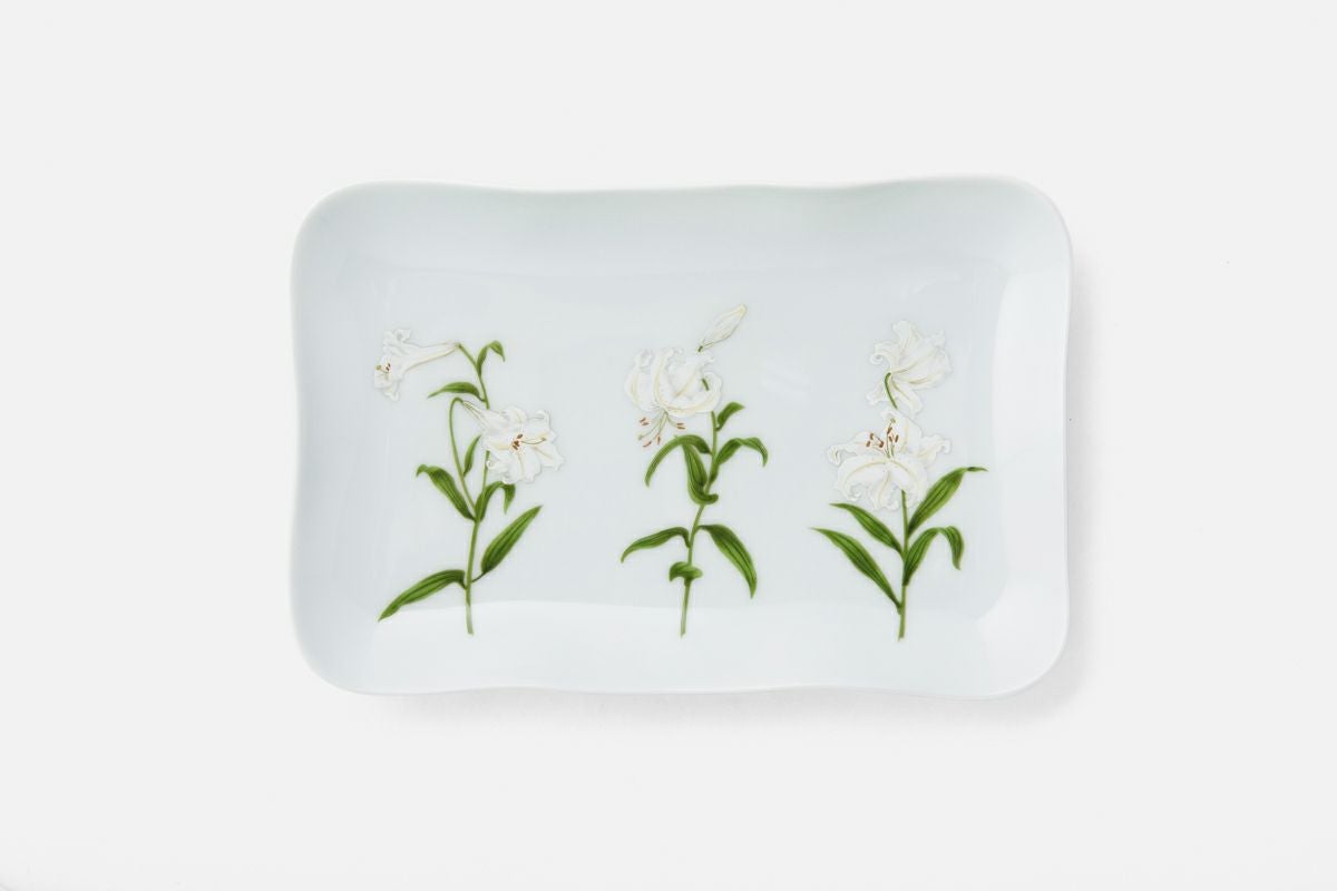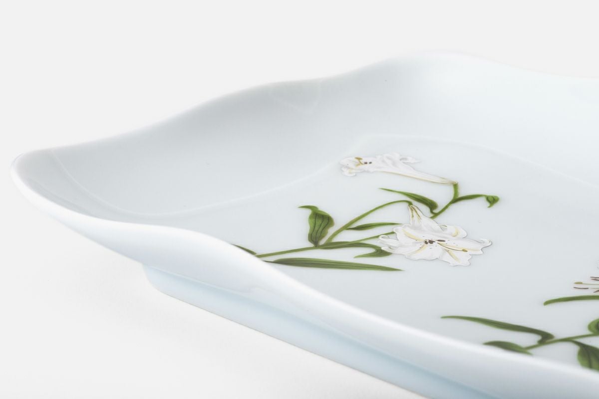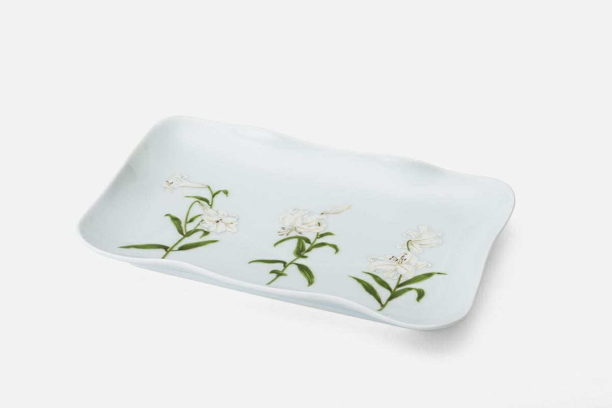 白百合の花言葉は「純潔、無垢」。何よりもこだわったのは、上品な「WHITE」です。上質な陶石を1350度の高温度で焼成する事により生まれる透けるような真白な磁器肌。幸せの大輪を咲かせたような優雅な白百合の花びらは、伝統的な技法によって特別に調合したいくつもの白い上絵具で描かれ、モダンなニュアンスをもつ柔らかな白のハーモニーが魅力です。愛らしいフリルのかたちにのせて優しい風に揺らぐ清楚な白百合の姿はまるでレリーフ。使う度に幸せに包まれるコレクションです。