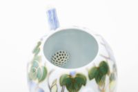 「朝顔」デザインは、明治期より深川製磁の代表的な意匠の一つとして、代々継承されてきました。本作も、明治期の欧州貿易の意匠のひとつで、アールヌーヴォーとは一線を画し、日本人の感性を全面に出すなど、いくつかの工夫を施しています。 染付のブルーと共に葉の部分のグリーンも下絵で絵付けし、工芸的な魅力を備えたエレガントな作品となっています。