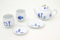 明治期に実際に制作されていた焼き物の意匠を小紋柄として描いたコレクションです。すべてブルーで描かれたこれらの陶磁器意匠は、伝統的な深川様式でありながらじつに、可愛くデザインされております。