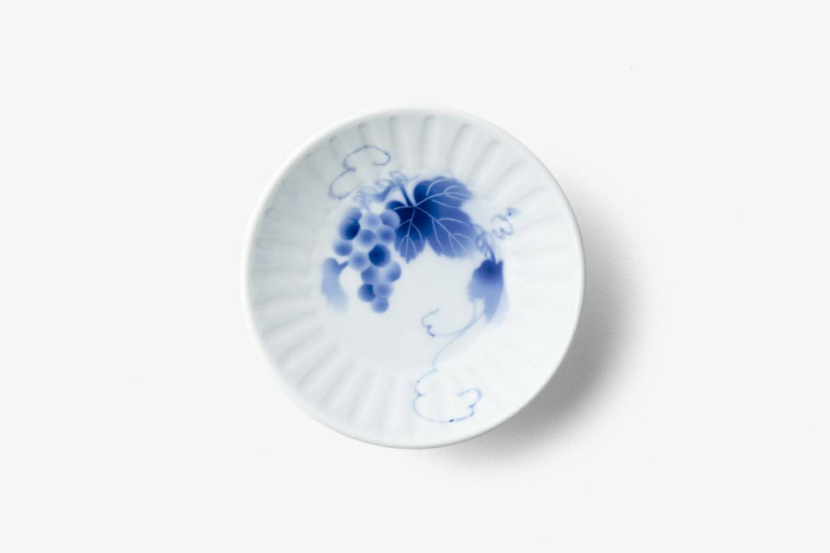 豊かな実りを表すぶどうを、100年の伝統を持つ吹き付け技法を用いた染付のグラデーションで表現。