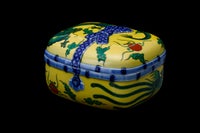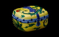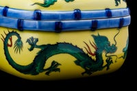 明治期に欧州へ輸出していた頃の意匠「竜鳳凰錦手黄地」の陶箱。竜と鳳凰は四霊のうち最高の吉祥を意味し、陶磁器においても数々の名品を生み出してきました。本作は、古来より皇帝にのみ用いる事を許されてきた鮮やかな「黄彩」に「緑彩」を用いて大胆に竜と鳳凰を大胆に描いています。中のお色は真っ白の陶白磁です。