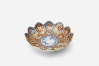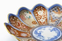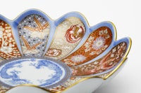 菊割の輪花鉢は、柿右衛門様式として広く知られています。19世紀末新しい有田の意匠として1900年パリ万国博覧会に出展した深川忠次は、彼のオリジナルデザインをパッチワークのようにこの輪花鉢の花弁に施しました。