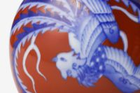本作品は、当時の輸出用デザインとフォルムを、現代の職人が丹念に再現したものです。赤地に映える染付の鳳凰が、優雅に舞う姿を描き出しています。鳳凰は古来より「平和と繁栄の象徴」とされ、吉兆をもたらす瑞鳥として親しまれてきました。