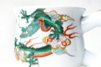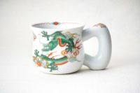 中国の皇帝だけに使用を許された五爪の龍をモティーフに、古くから「おめでたいしるし」として知られている四君子「蘭・竹・菊・梅」と、その永続を意図した「西海波」を釉上に描いたカップです。