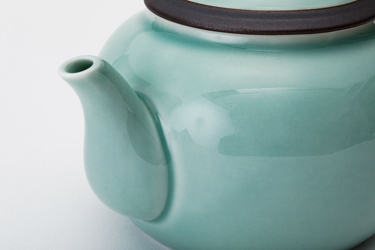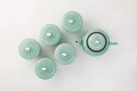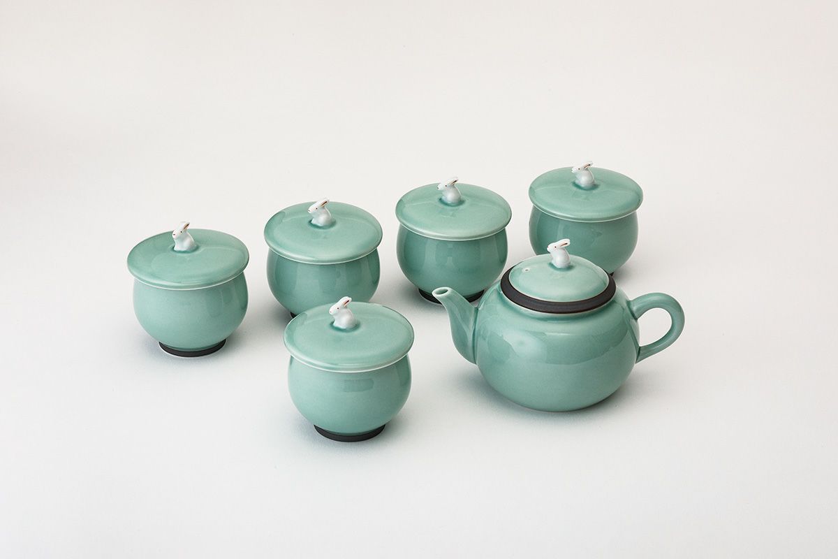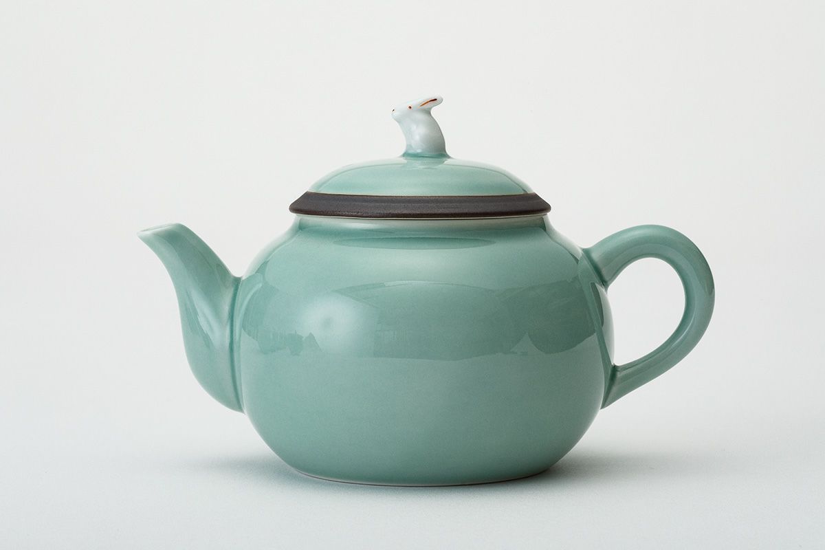 青磁色にうさぎのつまみがかわいらしい蓋付きの煎茶碗と急須付きの工芸作品です。玉露や中国茶にもおすすめなサイズです。