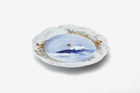 古くより日本では「ご来光」「初日」と「富士山」は、吉祥の意匠として親しまれてきました。 本作品は、明治期に海外輸出を始めた初代忠次が残した意匠絵から復刻したものです。 特に西洋には陶磁器に山を描くことが少ないこともあり、明治期の深川製磁の貿易品の中でも人気の図柄です。 リムには日本の四季折々の花を深川独自の盛り絵の具を使用して描いています。見込みに施されている富士の姿は、明治期に欧州から導入した技法「エアログラフ」(吹き掛け手法)で染付けています。 海外進物の飾り皿としても喜ばれております。