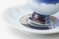 明治期以降、富士山をモチーフに多くの意匠を制作してきた深川製磁。エアログラフ(吹き付け)によるグラデーションは、官窯染付の良さを余すところなく表し、深川独自の「気韻」を醸しだしています。