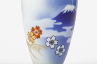 富士山のモチーフに桜と菱の絵柄を施した組酒杯。磁器ならではの滑らかな質感と優しい口当たりが特徴です。 お気に入りの絵付けが施された陶磁器で楽しむお酒の「色」、「香り」、「味」には他には無い特別な魅力があります。まさに自分の「嗜好」が、より強く確かめられるのが陶磁器の酒器と云えます。