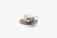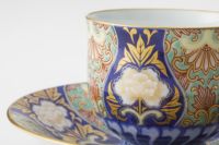 本作は染付の青、錦の赤と金、そして緑で描かれたアラベスク文様が美しい「古伊万里唐草」の意匠です。西洋と東洋の交流で生まれた魅力的な作品となっています。美しい意匠を愛でながらお気に入りの珈琲やエスプレッソをお楽しみ下さい。