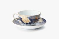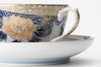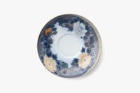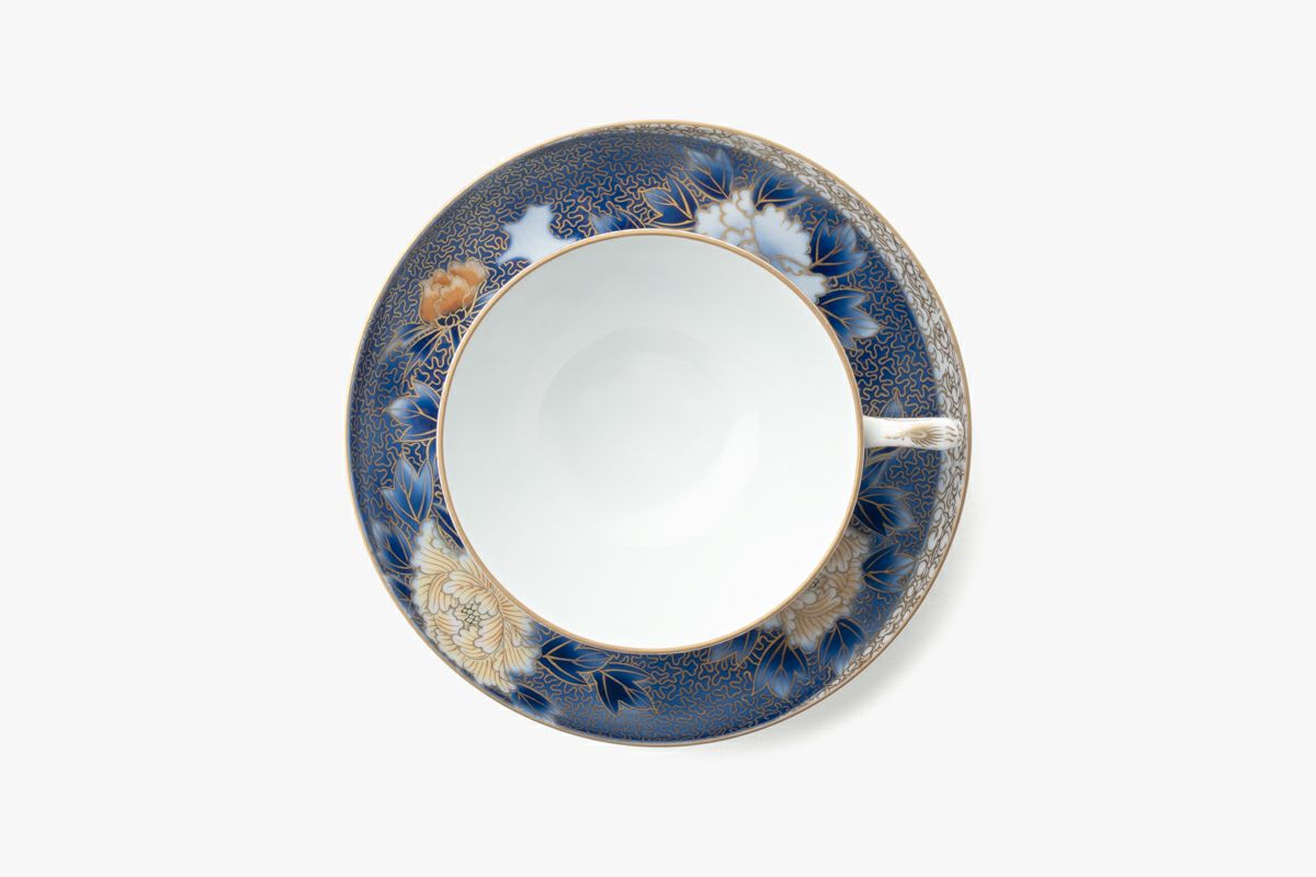 深川製磁らしさを表現した雲文牡丹金ミル。 金ミルは、終わりがない永遠を意味しています。また、最も古くから大切に 描いている牡丹を、深川の特徴的な瑠璃色で丁寧に描き、吉祥紋様である雲文 様を施し、ふたつの永遠が上品さと奥深さを追求した作品です。