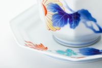 工芸文化の華ひらいた江戸時代に、有田で生まれた「柿右衛門様式」「色鍋島様式」は佐賀藩より幕府・朝廷に献上されました。また、長崎から海外にも輸出され、世界の陶磁器愛好家を虜にしました。 艶やかな文様は高度な「染付」「赤絵」技法により魅力的に表現されています。 『色絵菊花紋』はその伝統を継承する初代深川忠次が残した明治期の意匠図より現代に復刻したものです。染付の青と赤絵のコンビネーション「染錦」で描かれた文様は深川ならではのもので、ターコイズブルーの「うす青」「朱色」と黄色の「きび色」と全て自社調整する赤絵具の魅力が際立っている作品となっております。