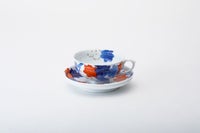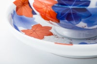 艶やかな「春秋文様」は、春の桜、秋の紅葉と「日本の四季」を表した吉祥文様で、江戸期より「粋」な様式として親しまれてきました。この意匠は、初代深川忠次が好んで描いたもので、エアログラフ(吹き掛け手法)を用いて楓の葉を染めて、釉薬を掛けて1,350度の窯で焼き上げ、さらに金彩と有田独自の盛絵具で桜文様を絵付けして800度強の錦窯で焼き上げた「染錦手法」のものです。 西洋文化を取り入れ、世界に開かれた明治期に、いち早く洋食器を制作・輸出した初代忠次、その心意気が感じられます。 明治27年創業の有田の工房で、当時の製陶技術を継承した職人が、当時と同じ製法で焼造したものです。