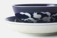 深川製磁の代名詞とも云える瑠璃色のうつわです。他にはない深みのある瑠璃地に、白抜きで花と葉をつけたざくろの折枝を表現致しました。お持ちの様々な色合いのうつわとも相性が良く、日常使いに活躍してくれるうつわになっています。