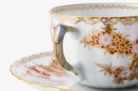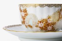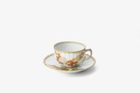 花の中にうずくまる兎をモチーフに上絵で仕上げた鍋島花兎シリーズの紅茶碗皿。