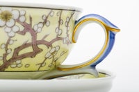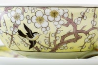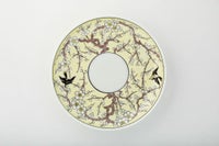 1900年パリ万国博覧会でメダーユドール(金賞)を獲得した初代深川忠次のエポックメーキングな図案です。 リム部に僅かばかりの余白を残ししっかりとした黒線できまりをつけています。当時、ヨーロッパ工芸を席巻したアールヌーボーに多大な影響を与えたと云うジャポネスクは、花鳥図をその粋としていました。写実的な木花にアクセントをつけるように舞う鳥は、あえて黒く措かれ、全体の色調に品のよいバランスを与えています。このクラシカルモダンな様式は、明治モダニズムとしてサザビィーズやクリスティーズに紹介され深川独自の様式美として知られています。