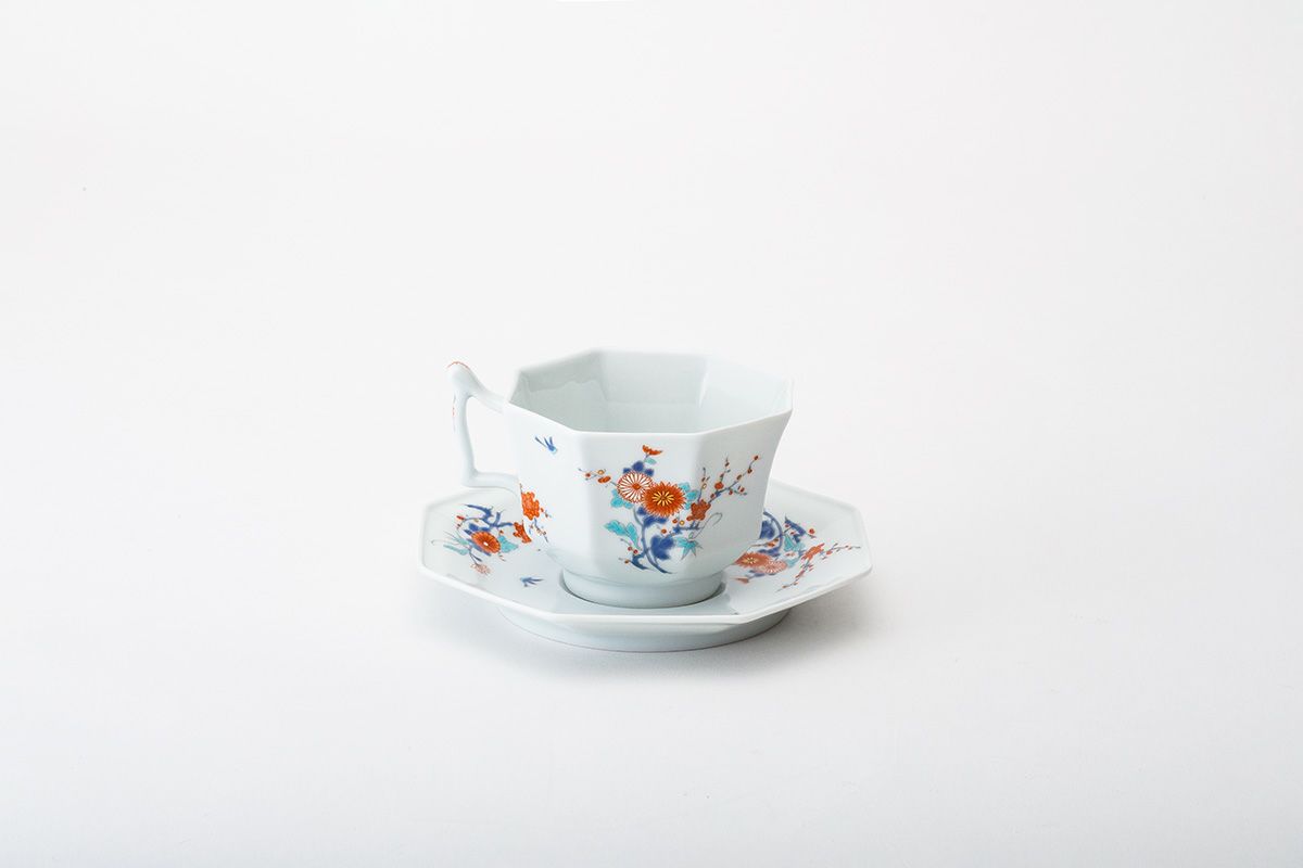 色絵花鳥紋 八角紅茶碗皿