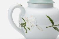 白百合の花言葉は「純潔、無垢」。何よりもこだわったのは、上品な「WHITE」です。上質な陶石を1350度の高温度で焼成する事により生まれる透けるような真白な磁器肌。幸せの大輪を咲かせたような優雅な白百合の花びらは、伝統的な技法によって特別に調合したいくつもの白い上絵具で描かれ、モダンなニュアンスをもつ柔らかな白のハーモニーが魅力です。愛らしいフリルのかたちにのせて優しい風に揺らぐ清楚な白百合の姿はまるでレリーフ。使う度に幸せに包まれるコレクションです。