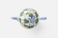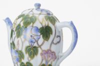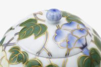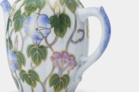 「朝顔」デザインは、明治期より深川製磁の代表的な意匠の一つとして、代々継承されてきました。本作も、明治期の欧州貿易の意匠のひとつで、アールヌーヴォーとは一線を画し、日本人の感性を全面に出すなど、いくつかの工夫を施しています。 染付のブルーと共に葉の部分のグリーンも下絵で絵付けし、工芸的な魅力を備えたエレガントな作品となっています。